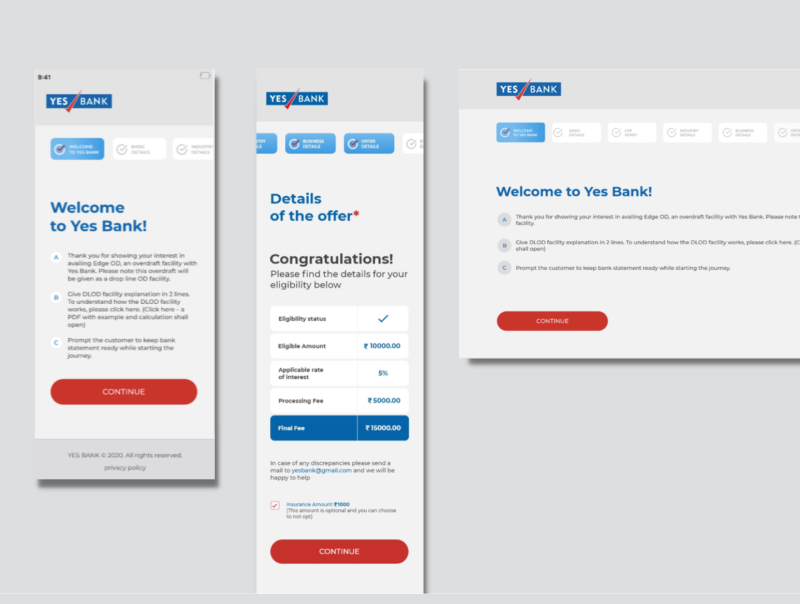 This was followed with design exploration with the Decimal Technologies and YES BANK team till we settled for the design that responded to the various stake holders expectations. It resulted in an Onboarding and experience journey that brought human-centric simplicity and low cognitive load to the complex space of over draft.